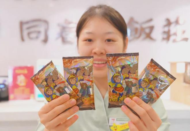 除了美食与周边,趣味十足的卡牌对战活动让用餐场景充满欢声笑语。消费者购买任意联名套餐,即可随机获得一张“西游法宝卡牌”,卡牌上印着孙悟空、牛魔王、哪吒、红孩儿、猪八戒等西游角色的战斗力数值。在各门店设置的对战区,不时能看到大人小孩围坐一桌,手持卡牌展开比拼,按照简单易懂的规则较量“法宝威力”,获胜者可兑换甜品或饮品券。