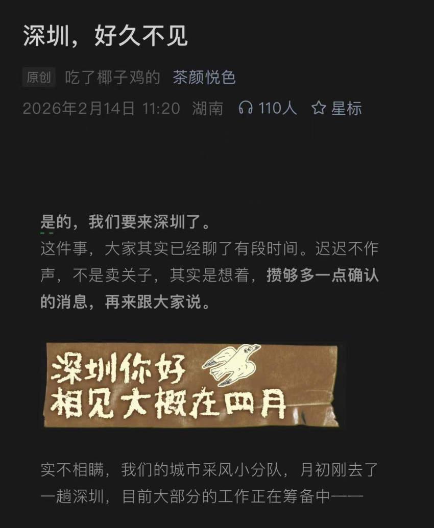 “这里真的很好,好像不管什么时候来,这个城市都好像在邀你入座”。推文中,茶颜悦色方面表示,希望以茶为媒介,搭建起与深圳这座创新、开放、包容城市的沟通桥梁,实现品牌文化与城市精神的深度共鸣。